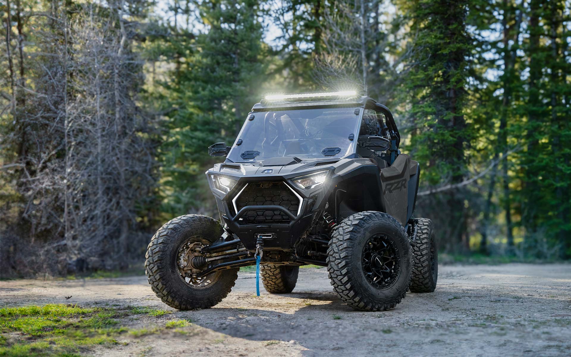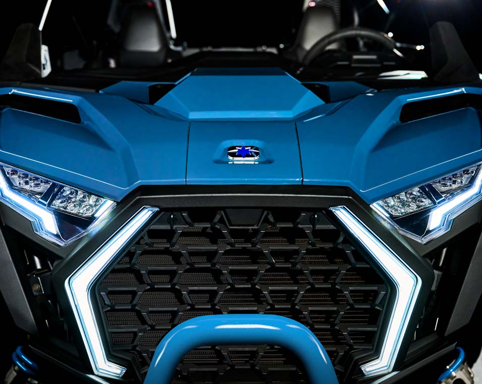 - Signature RZR Fang-Akzentbeleuchtung; weiße LED-Abblend- und Fernlichter sowie rote LED-Rück- und Bremslichter; animierte Innenraumbeleuchtung